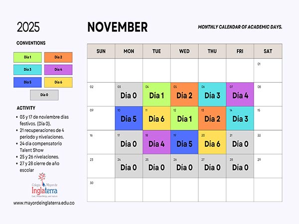 En este calendario podrás ubicar de manera rápida el número de día académico (del 1 al 6) correspondiente a cada fecha.